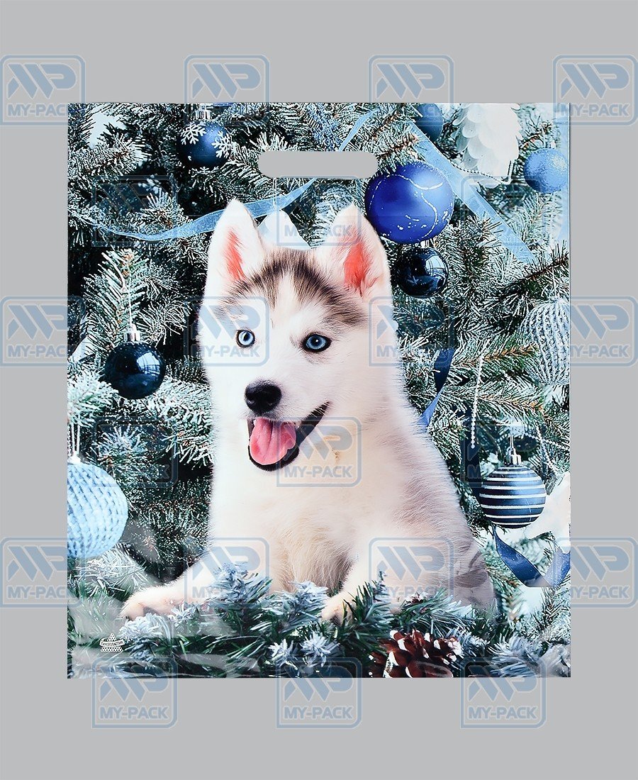 Новогодний пакет 38см*45см(+3)*60мкм, ПВД "Веселый хаски"