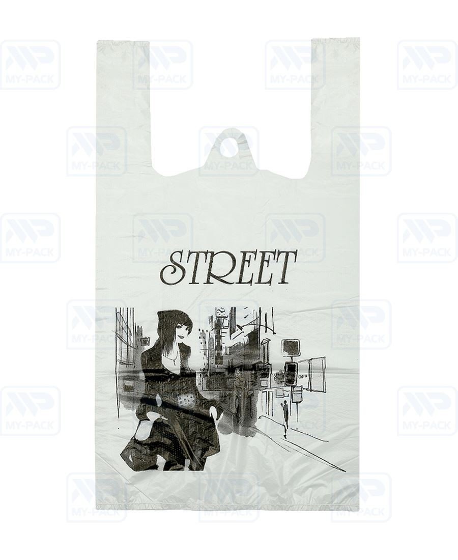 Пакет-майка с рисунком "Street" для упаковки промтоваров и продуктов питания и повышения покупательской лояльности. Изготавливается из ПНД, шуршит при смятии, подходит для торговых точек и неоднократного использования в быту.